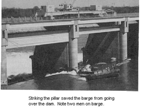 In March 1972, a barge loaded with liquid chlorine (LCl2) broke its towline in the Ohio River near Louisville, Kentucky, U.S.A. Drifting backward in a 13-knot current, the barge punctured its hull as it struck a pillar of a dam, part of a hydroelectric complex (Figure 1). The barge was subsequently pierced by submerged concrete obstructions inside the spillway. The four 21-metre long tanks held a total of 640 tons of liquid chlorine, capable of releasing a poison gas cloud into Louisville, just downwind.