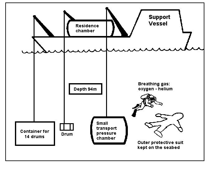 In April 1977, the operation for the salvage of the drums began. Saturation diving using a mixture of oxygen and helium was utilized. For safety reasons, work was only carried out under favourable meteo-oceanic conditions and in daylight. Divers worked in pairs for 8 hours/day for 20 days. When not working, they stayed the rest of the time in a pressure chamber on the deck of one of the vessels. After 20 days under pressure, the divers were subjected to a 3-day decompression period after which a new team of two divers took over. During the work phase, the pressure chamber would be lowered to a place close to the wreck, the divers would exit and don outer protecting suits left on the seabed (Figure 1). Radio communications took place between the divers and the salvage vessel during the salvage operation.