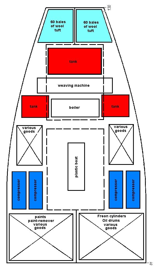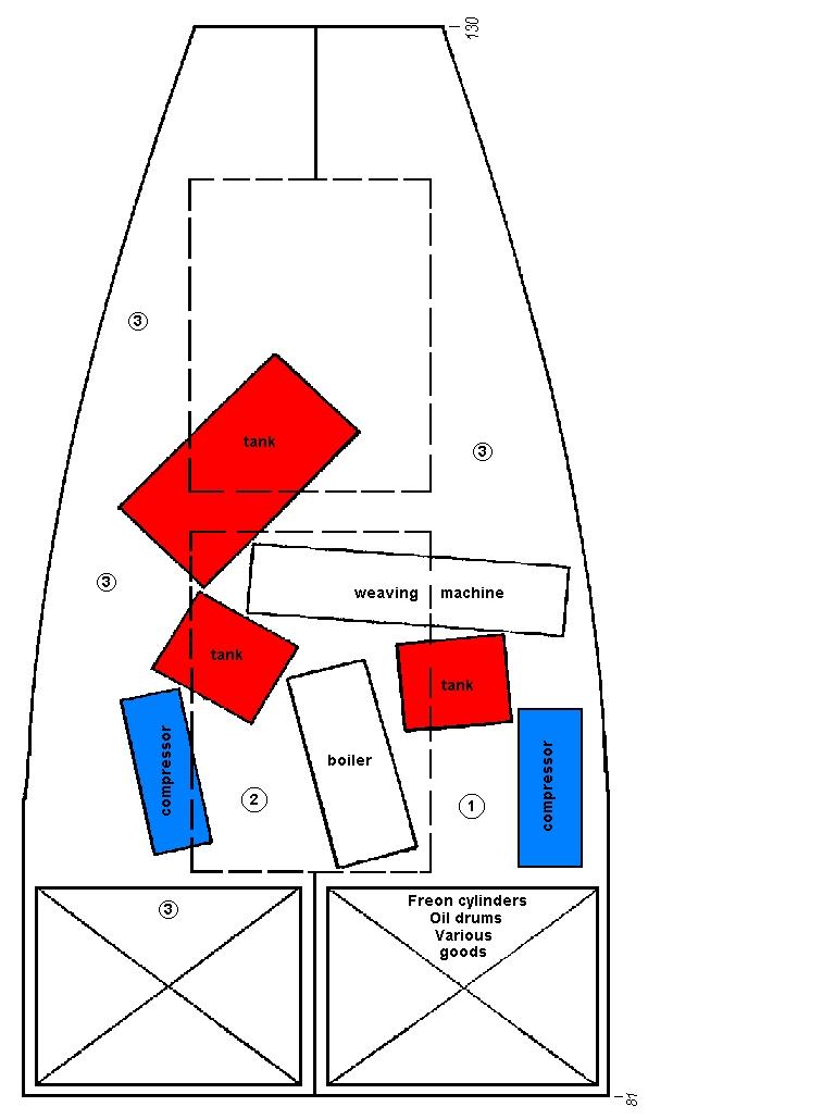 In July 1977, hold No. 1 was opened. According the loading plan, cargo should have been stowed as shown in Figure 2 but the situation found was in fact that shown in Figure 3. This cargo had to be removed to get at the other drums.