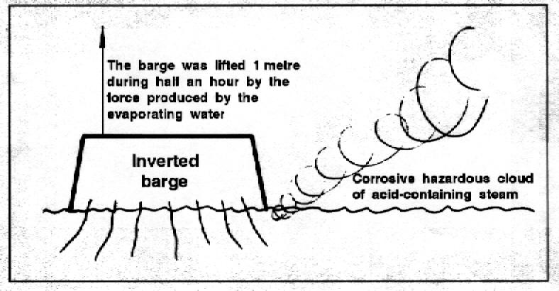 The two crane barges were lashed together and two heavy wire cables were passed under the barge and around the barge to the towing bits on the near side. One of the wire cables parted on the first righting attempt and was replaced by a chain. Upon righting, there was no indication of any acid-water interaction or vapour cloud production. Onboard inspection of the barge showed that the tanks were full of water rather than acid. There was evidence of recent corrosion around the cargo tank hatches whilst the cargo tank gaskets and seals were missing. Cargo tank tops were deformed inwards indicating that there had been a vacuum inside the tanks. The explanation for this was that when the barge capsized, the load of the heavy liquid bore directly on the inverted tank tops. The structure along with the external framing and tanks tops were being designed for this load and deformed outwards. Where the cargo was released, the tanks were full of steam, acid mist and hot air. A vacuum developed with a resultant deformation of the tank tops inward due to the rapid reduction in pressure caused by cooling and condensation which could not be adequately compensated for by the water drawn in through the open hatches. Unfortunately, the fact that cargo had been released only came to light at the inquiry some weeks later when the cook on the tug was asked if there was anything else he could remember about the incident!