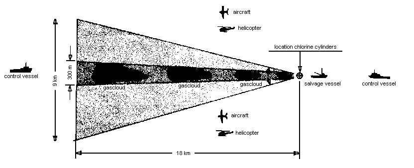 The effect of exposure to chlorine is determined by two main factors: 1) concentration of the substance in the air; and 2) length of exposure. Computer models were used to estimate how large an area needed to be kept free of shipping during the time the cylinders were being destroyed. Since the density of chlorine is three times that of air, a dense-cloud model was used for this purpose. Worst-case predictions were prepared on the basis of an instantaneous release, under the influence of various wind speeds. This was done to investigate the movement of a chlorine gas cloud under different weather conditions.