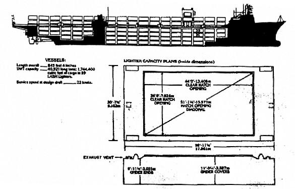 Lighter Aboard Ships (LASH) are large, low ships with no sheer and very little superstructure. They carry watertight containers. The containers are non-propelled barges that are loaded and discharged from the vessel into the water using an onboard crane, allowing them to be used independently of the mother ship. Although the barges are watertight, they can be ventilated by forced air from the mother ship via exhaust vents in both ends. In this particular case, the LASH vessel carried 89 stacked containers.