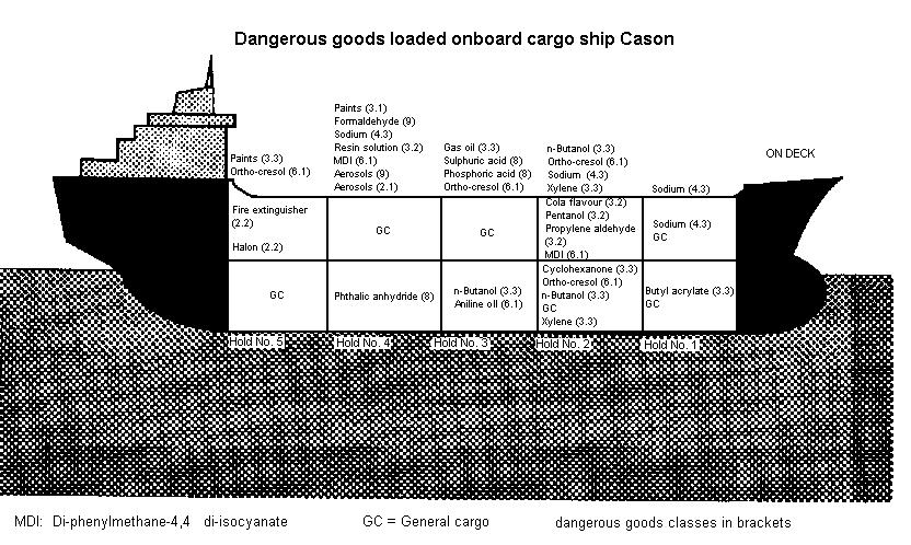 The Spanish authorities however contended that the stowage arrangement of dangerous goods in the holds of the Cason added considerably to the difficulties of recovery. They further agreed that this slow progress meant that the cargo would have to stay onboard longer and the longer dangerous substances remain on a vessel, the greater the likelihood of pollution.