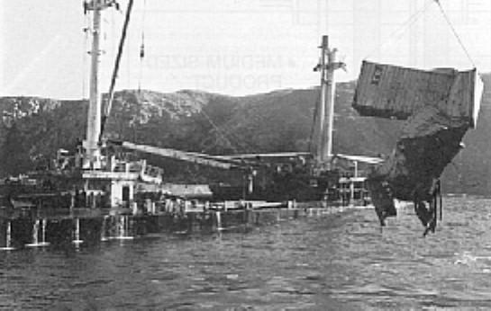 From February 18, 1988 onwards, the weather improved and it was possible to work more or less continuously. The dangerous cargo was recovered, although great technical difficulties were experienced in unloading the drums stowed below deck as the fire and the action of the heavy seas had moved the general cargo haphazardly. This blocked access to the dangerous cargo. It was decided to use a large crane equipped with a grab which was capable of tearing the ship's deck and sides apart. This allows getting at the dangerous goods.