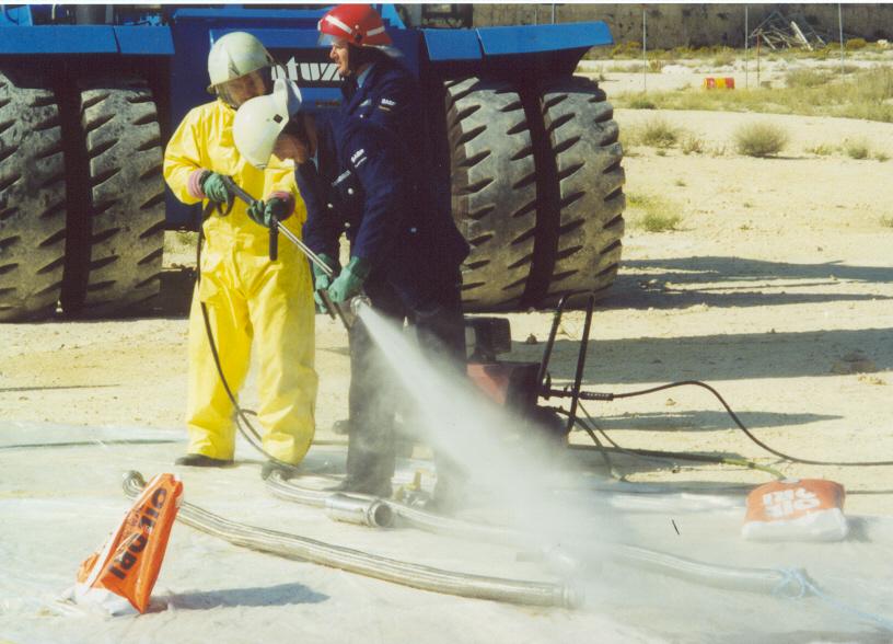 Following transfer, hoses and other equipment were decontaminated by washing with water. A simple decontamination area was set up using plastic sheets (Figure 5). Residual acrylic acid remaining in the hoses was poured over aluminium silicate and the hoses and other equipment washed with a fine water spray (Figure 6). Since acrylic acid is a "ready biodegradable" substance, all wastes from the decontamination process were sent to a landfill. The transfer operation took approximately 3 hours. Since the origin of the leak was not determined, the damaged tank container was allowed to drip for an additional 24 hours after which it was shipped on 31 October to the Port of Rotterdam where the leasing company of the tank container had a facility. The requirements followed for the transportation of the empty damaged container was that as stipulated by the IMDG Code, namely that an unclean container should be treated as a loaded container with product. The full container left for Saudi Arabia on 29 October.