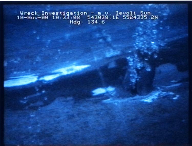 3) Surveillance of the wreck: the zone around the ship was marked off by four buoys set up by UK vessels. Video inspections using an ROV confirmed that the shipwreck came to lie on its port side on sand at a distance from the "Casquests" trench on a slight slope. It was considered unlikely that the wreck would slip towards the trench. Video inspections carried out on 10 and 11 November showed a stream of bubbles near the styrene tanks at the rear starboard side (Figure 4). The rate of loss was estimated at 30 litres/minute and 3 litres/minute on 10 and 11 November respectively. New video inspections are planned in view of analyzing the reasons for the leaks and to assess how these can be plugged.